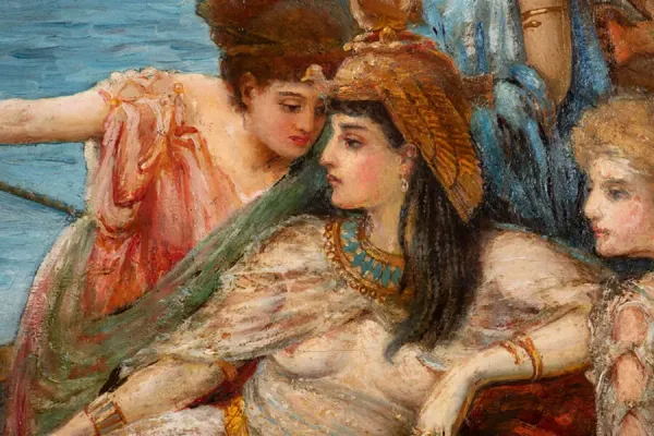 Stacy Shiff Cleopatra: A Life adlı kitabında şöyle anlatır; “dalgalanan mor yelkenlerin altında bir renk patlaması ile şehre doğru yelken açtı. Altın pullu bir gölgeliğin altında, resimdeki Venüs gibi giyinmiş, uzanmış yatıyordu. Resimli aşk tanrıları gibi güzel genç oğlanlar da yanlarında durup onu yelpazeliyorlardı. En güzel hizmetçileri de deniz perileri gibi giyinmişlerdi. Bazıları dümeni yönetiyor, bazıları halatlarla uğraşıyordu. Sayısız tütsü sunusundan gelen harika kokular nehir kıyılarına yayılıyordu”.