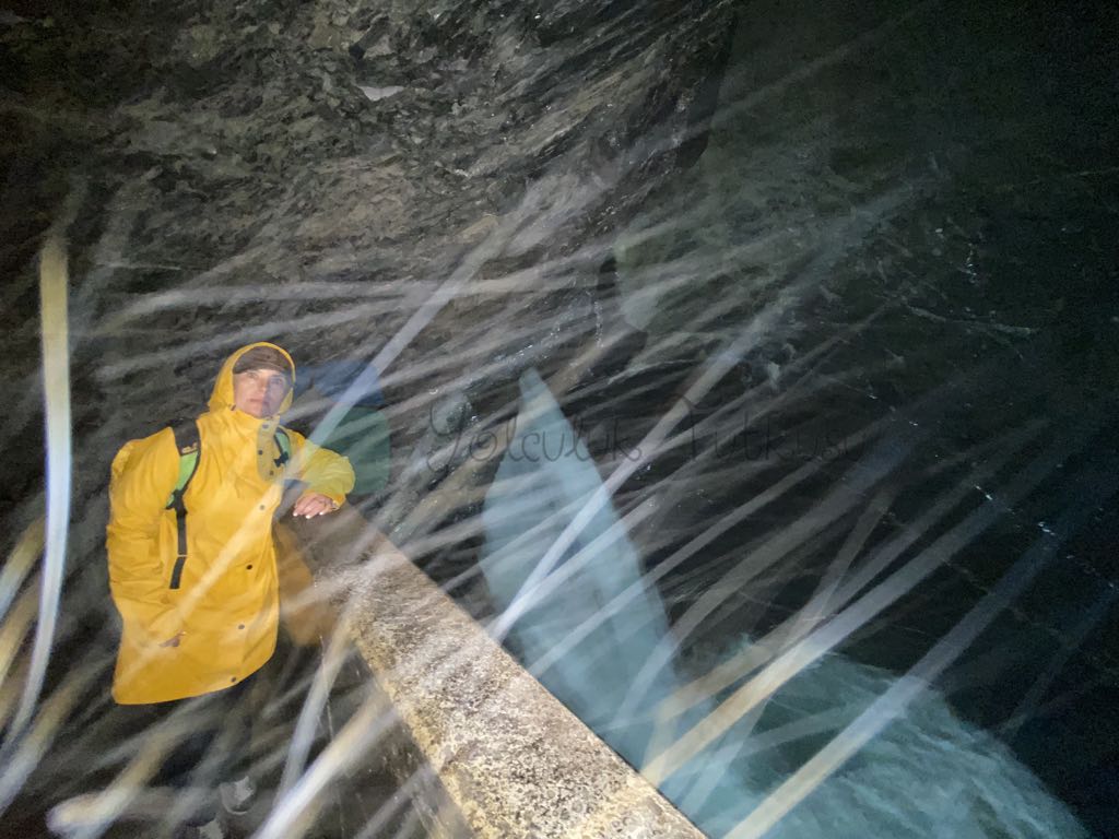 Şelalenin içerisi oldukça serin ve güçlü bir hava akımı var.