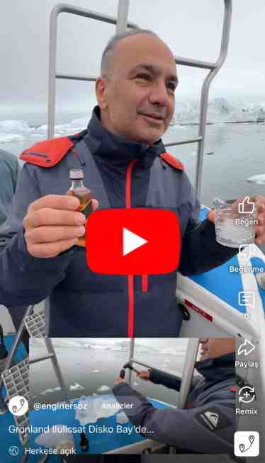 Teknedeki çalışanlar kepçe ile Iceberg parçalarını tekneye aldılar. Üzerindeki kısım tuzlu su ile temasta olduğu için üstten belli bir kısmını kırarak alttaki kısımdan buz aldık. 2.000 ila 200.000 yaşında olabilecek bu buz ile 12 yıllık bir Black Label içmek gerçekten özel bir andı. Bizim turumuzda güneş ara sıra kendini gösterdiği için tam anlamı ile şahit olamadık ama yine de çok çok özel bir tecrübeydi.
