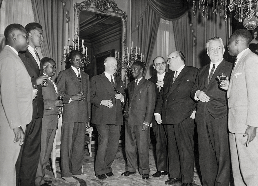 Ruanda’nın ilk seçilen Başkanı Grégoire Kayibanda (ortada), Afrika ve Belçika hükümet temsilcileriyle birlikte, Brüksel, 1961